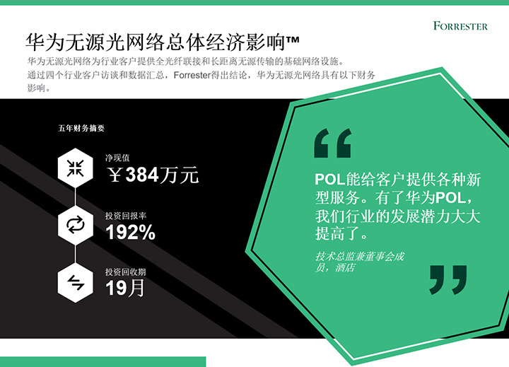 2022年上半年,華為委托權(quán)威咨詢公司Forrester進行了《華為無源光網(wǎng)絡(luò)總體經(jīng)濟影響™》研究。在本研究中,F(xiàn)orrester通過客戶訪談,以專有方法論分析部署華為無源光網(wǎng)絡(luò)(Passive optical LAN,POL)方案對企業(yè)帶來的經(jīng)濟影響。研究結(jié)果顯示,企業(yè)使用華為POL五年投資回報率達(dá)192%,投資回報周期為19個月。