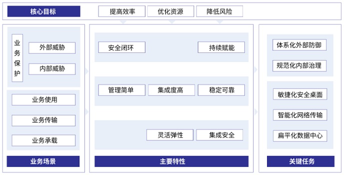 數(shù)字化轉(zhuǎn)型的核心目標(biāo)是“提高效率、優(yōu)化資源、降低風(fēng)險(xiǎn)”,業(yè)務(wù)場(chǎng)景包含“業(yè)務(wù)保護(hù)、業(yè)務(wù)使用、業(yè)務(wù)傳輸、業(yè)務(wù)承載”,將核心目標(biāo)與業(yè)務(wù)場(chǎng)景相結(jié)合,可明確數(shù)字化轉(zhuǎn)型關(guān)鍵任務(wù)為“體系化外部防御、規(guī)范化內(nèi)部治理、敏捷化安全桌面、智能化網(wǎng)絡(luò)傳輸、扁平化數(shù)據(jù)中心”。企業(yè)可進(jìn)一步結(jié)合自身的發(fā)展情況,從最為緊迫的關(guān)鍵任務(wù)入手,一步步走好轉(zhuǎn)型之路。