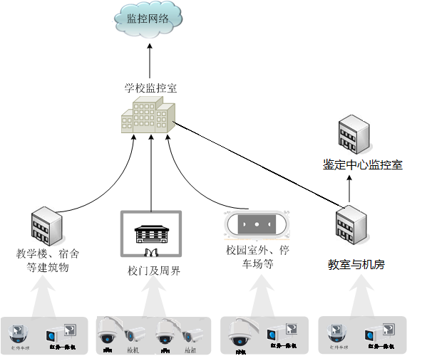 (5)視頻監(jiān)控系統(tǒng)主要由前端攝像機(jī)組成,根據(jù)現(xiàn)場(chǎng)不同的環(huán)境和應(yīng)用選用不同的攝像機(jī),在出入口選擇紅外攝像機(jī),在樓梯口和走廊設(shè)置紅外槍式攝像機(jī)及寬動(dòng)態(tài)紅外攝像機(jī),在周界可以選用紅外槍式攝像機(jī),在學(xué)院室外開(kāi)闊區(qū)域選用室外球型攝像機(jī)等。