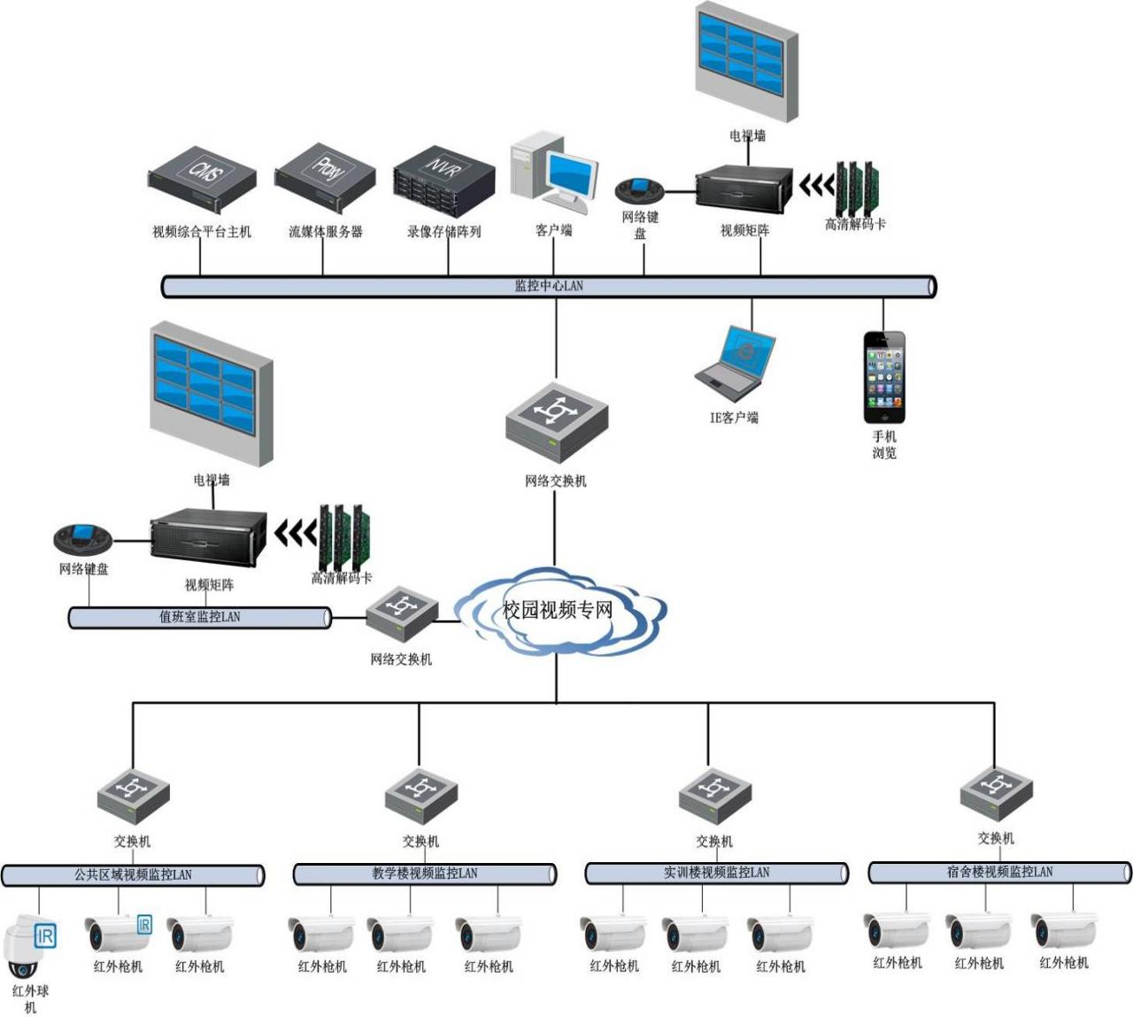 為了最大限度地節(jié)省資源、降低運(yùn)行和人力管理成本、避免重復(fù)投資,結(jié)合學(xué)校本部、某校區(qū)已建成的視頻監(jiān)控系統(tǒng),本次新建系統(tǒng)與兩個(gè)校區(qū)現(xiàn)有視頻監(jiān)控系統(tǒng)無(wú)縫對(duì)接。
